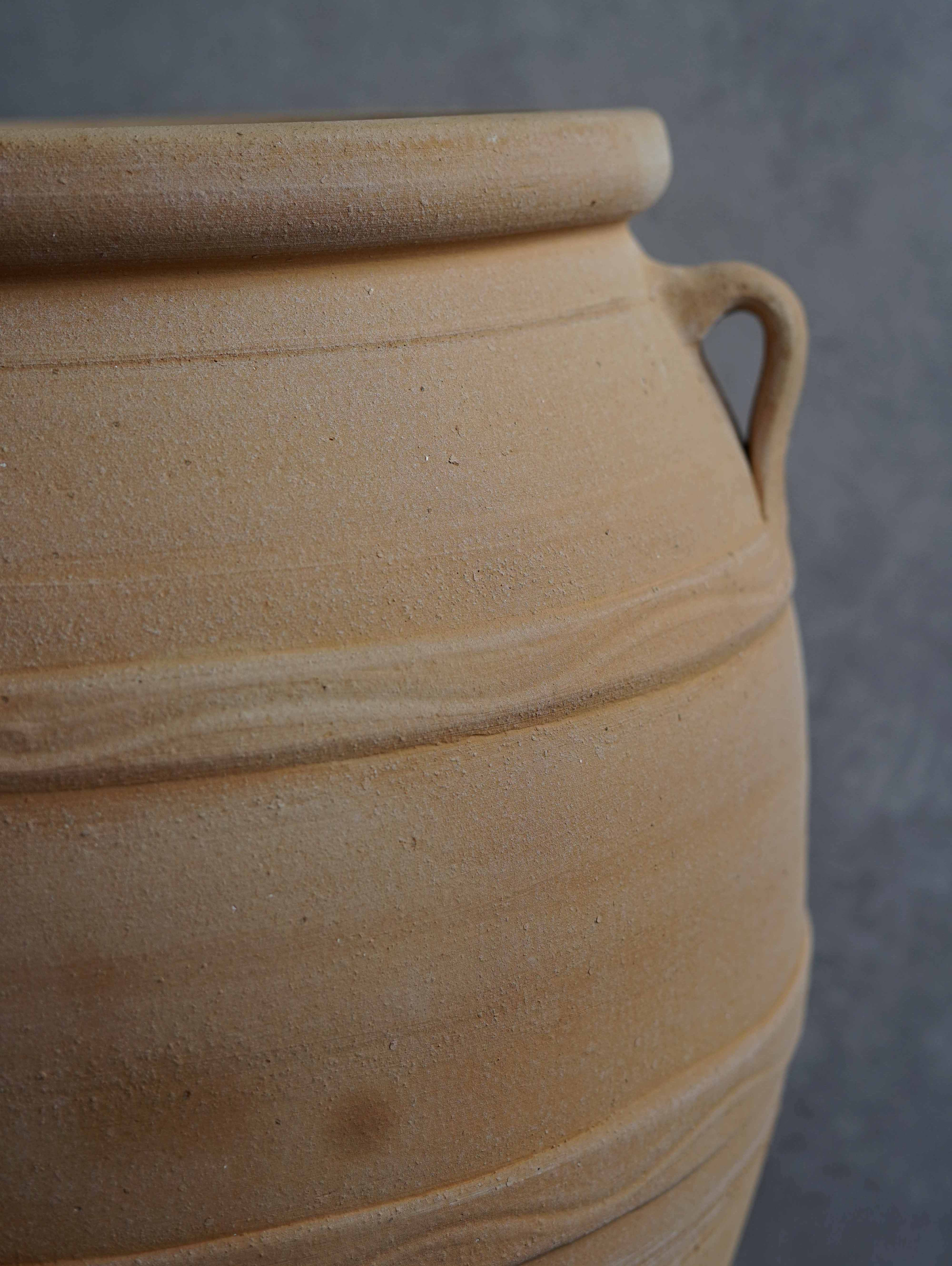 A more traditional version of the Milatos Minoan storage jar, featuring the classic Pithari shape and side handles along with broad banding and prominent wave design. The large opening at the top makes it ideal for specimen planting. Cretan terracotta pots don’t come more classic than this.